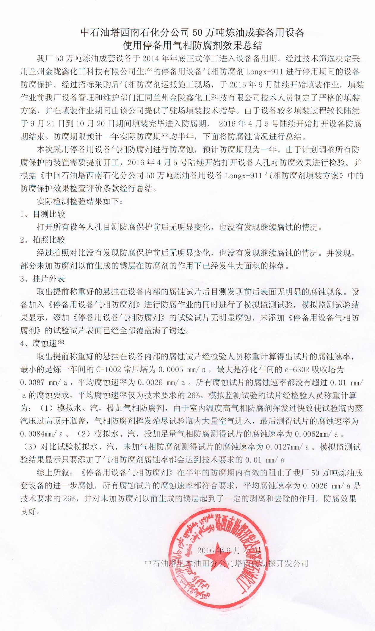 實(shí)用新型專利證書 《停備用設(shè)備氣相防腐劑》用戶使用效果報告